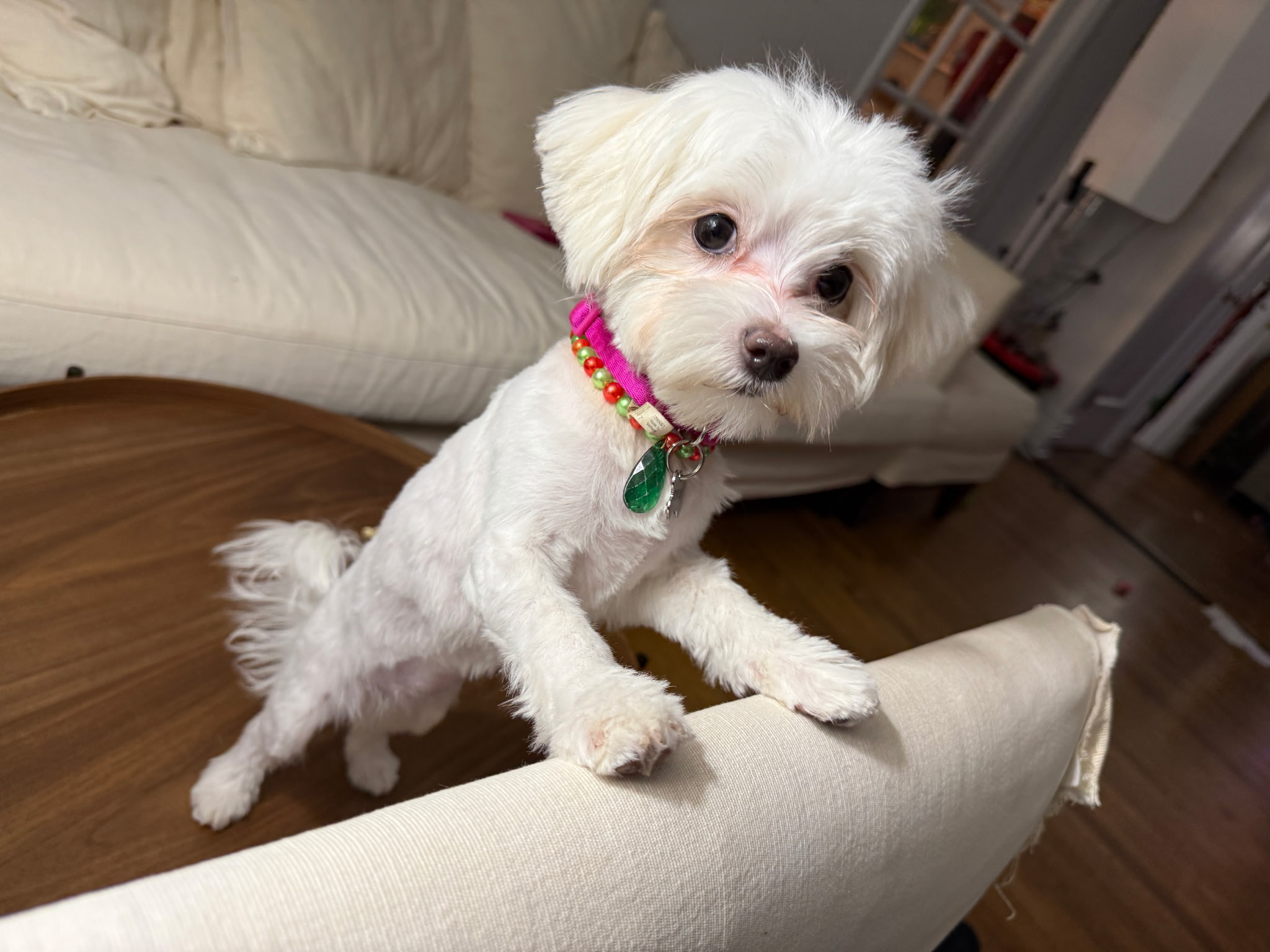 Charlie McTiddle is a sweet and sassy Maltese with big, soulful eyes and a perfectly groomed white coat. She loves basking in the sun while keeping a close watch on everything around her like the tiny queen she is.